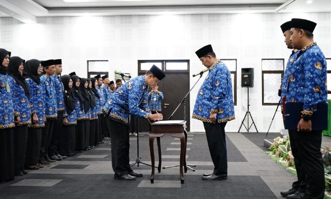 Foto: Bupati Kulon Progo, Agung Setyawan, melantik dan mengambil sumpah jabatan 100 kepala sekolah dan pejabat fungsional di Aula Adikarto, Kulon Progo, Jumat (6/3/2026).