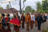 Foto: Abdi Dalem Karaton Surakarta Hadiningrat bersama warga mengikuti kirab budaya menuju pasareyan Panembahan Agung Kajoran dalam rangka upacara Sadranan Leluhur di Kajoran, Kabupaten…