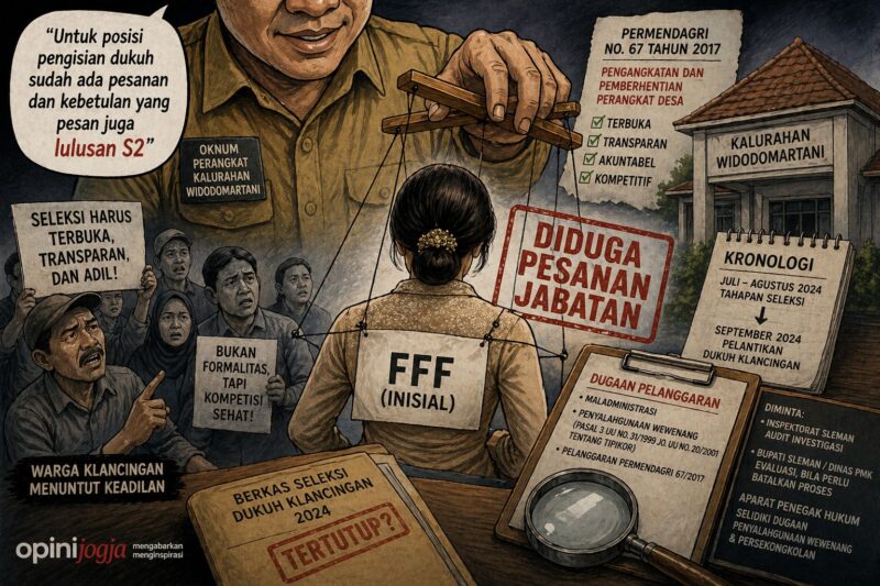 SLEMAN, opinijogja – Proses pengisian jabatan Kepala Dukuh Klancingan, Kalurahan Widodomartani, Kapanewon Ngemplak, Kabupaten Sleman, menuai sorotan. Sejumlah warga menduga adanya praktik pengkondisian serta maladministrasi dalam tahapan seleksi yang berlangsung pada tahun 2024.