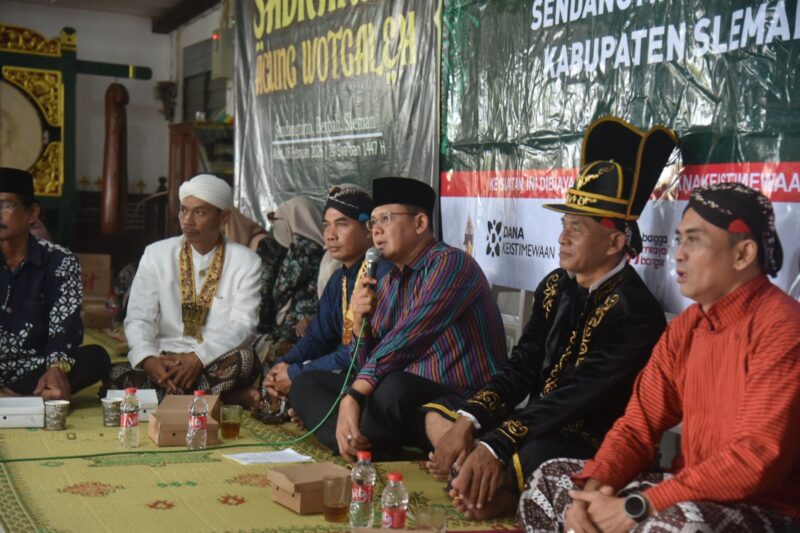 Foto: Wakil Bupati Sleman Danang Maharsa menyampaikan sambutan saat Sadranan Agung Wotgaleh di Kalurahan Sendangtirto, Kapanewon Berbah, Sleman, Minggu (8/2/2026).