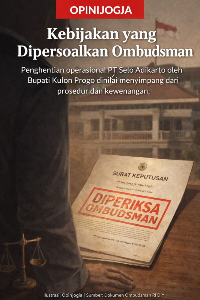 KULON PROGO, opinijogja — Minggu, 01 Februari 2026, Perwakilan Ombudsman Republik Indonesia Daerah Istimewa Yogyakarta menilai kebijakan Bupati Kulon Progo yang menghentikan kegiatan bisnis dan usaha PT Selo Adikarto sebagai tindakan maladministrasi. Penghentian tersebut dinilai menyimpang dari prosedur dan melampaui kewenangan kepala daerah.