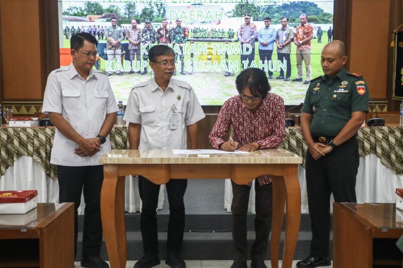 Sleman, opinijogja – Pemerintah Kabupaten Sleman melalui Dinas Pemberdayaan Masyarakat dan Kalurahan (PMK) menandatangani Naskah Perjanjian Hibah Daerah (NPHD) bersama empat Lembaga Pemberdayaan Masyarakat Kalurahan (LPMK) untuk pelaksanaan program Tentara Manunggal Membangun Desa (TMMD) Tahun Anggaran 2026.