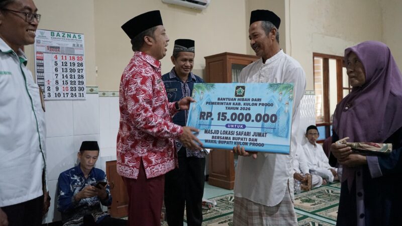 Foto:Wakil Bupati Kulon Progo menyerahkan secara simbolis bantuan hibah pembangunan masjid senilai Rp15 juta dalam kegiatan Safari Jumat Tingkat Kabupaten 2026 di Masjid Al-Barokah, Kalurahan Glagah, Kapanewon Temon, Jumat (23/1/2026).