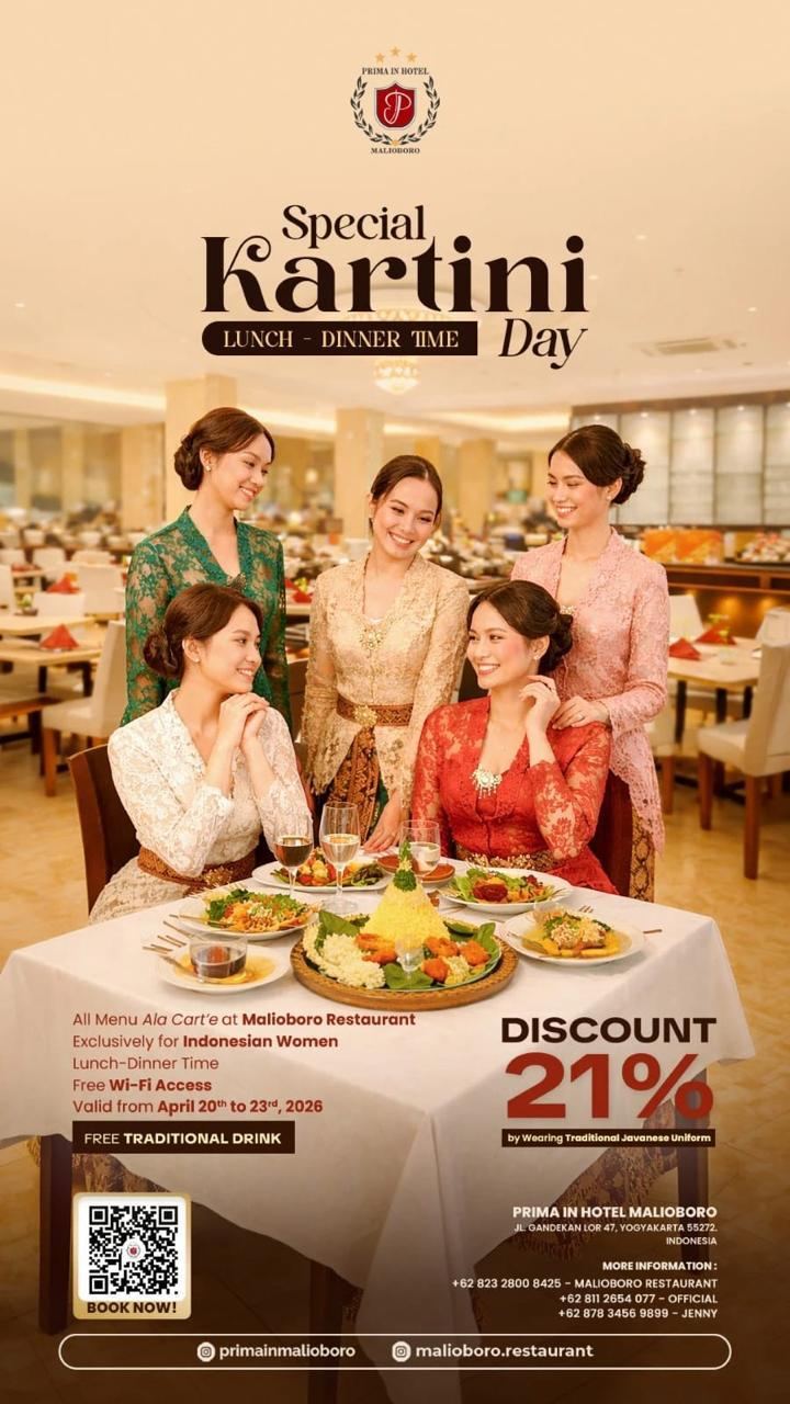 Dalam rangka memperingati Hari Kartini, restoran tersebut menghadirkan promo spesial sebagai bentuk apresiasi kepada perempuan Indonesia. Mengusung suasana kebersamaan, pengunjung diajak menikmati sajian kuliner dalam balutan nuansa elegan khas Malioboro.