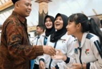 Foto: Bupati Sleman Harda Kiswaya menyapa dan memberikan semangat kepada para atlet pelajar saat pelepasan kontingen POPDA Kabupaten Sleman 2026 di Pendopo Parasamya, Kantor…
