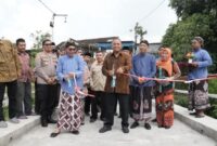 Foto: Bupati Sleman Harda Kiswaya (tengah) didampingi jajaran pemerintah dan tokoh masyarakat meresmikan Jembatan Jatra Winongo dengan prosesi pemotongan pita di Kalurahan Sinduadi, Mlati,…