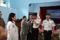 Foto: Petugas Direktorat Jenderal Imigrasi melakukan penyematan tanda kepada Petugas Imigrasi Pembina Desa (Pimpasa) dalam kegiatan pengukuhan Desa Binaan Imigrasi di Aula Kalurahan Triharjo,…